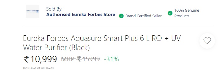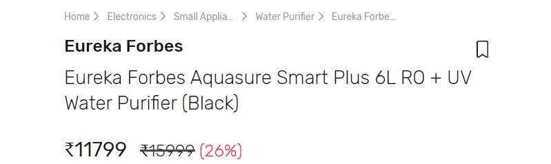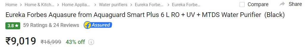 Buy Eureka Forbes AquaSure from Aquaguard Smart Plus (RO+UV+MTDS) 6L water purifier,6 stages of purification (Black) At Just Rs. 8999 Get Extra Rs. 600 Using Coupon Code and get it for Rs. 8399 with Lowest Online Price + Free Shipping. Hurry Up !!