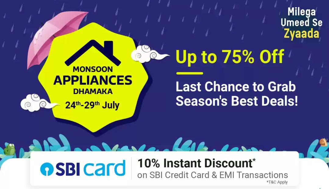 Hii, check out Monsoon Appliance Dhamaka sale on Flipkart. So, if you missed the last sale, check this out to buy appliances at a much lower price. The sale will end today on 29th July. Shop for your desired appliance and avail up to 75% off on your shopping. Also, you can get Extra 10% Instant Discount with SBI Credit Cards.