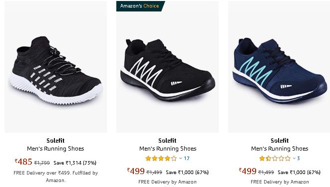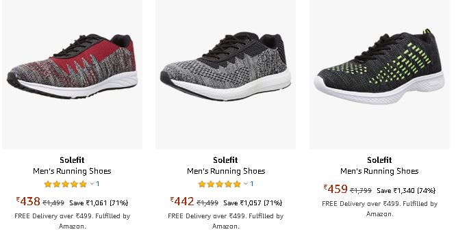 Amazon is running a discount on Men's Footwear They are giving Solefit Running Shoes Min. 60% - 70% off From Rs. 438. These shoes are lightweight, comfortable, sturdy and extremely sporty. Free Shipping for Prime members and For Non-Prime User after order above Rs.499.